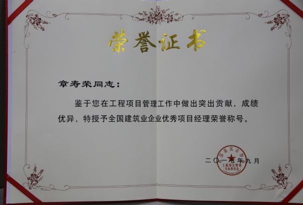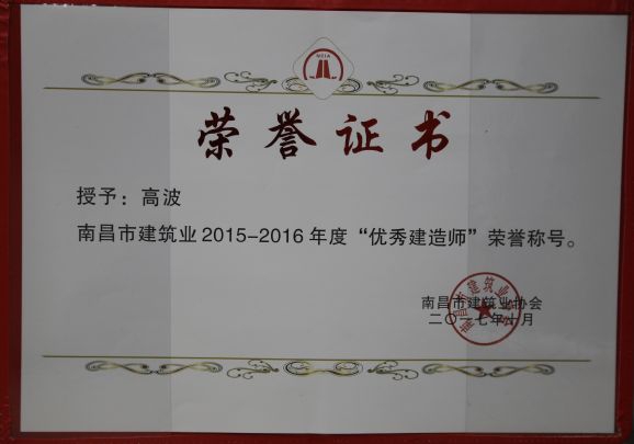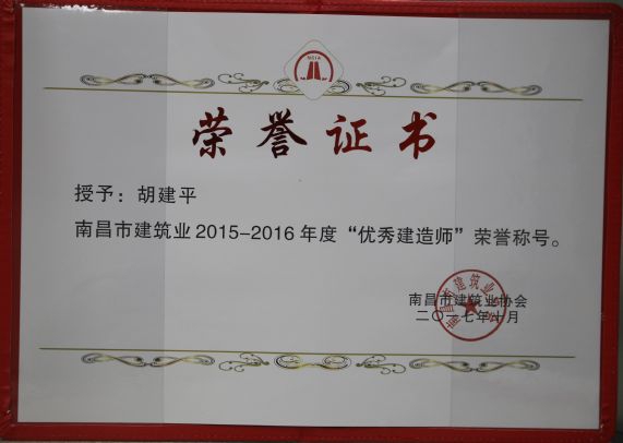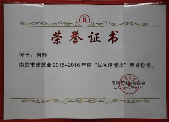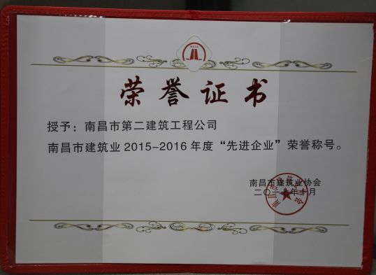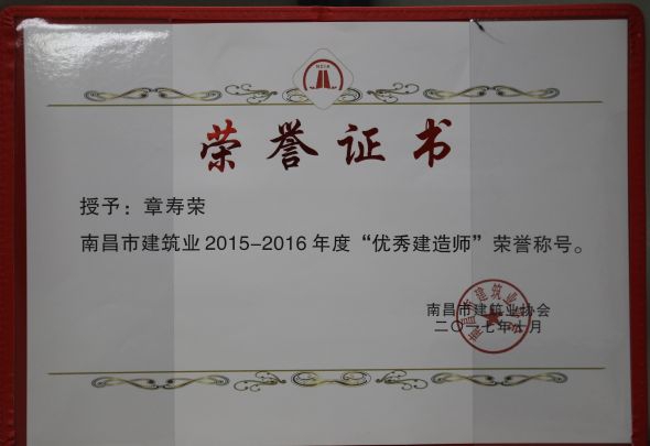南昌市建筑業(yè)協(xié)會對公司頒發(fā)了南昌市建筑業(yè)2015-2016年度“先進(jìn)企業(yè)”榮譽稱號,對公司建造師章壽榮、何靜、胡建平、高波頒發(fā)了南昌市建筑業(yè)2015-2016年度“優(yōu)秀建造師”榮譽稱號;中國建筑業(yè)協(xié)會對章壽榮頒發(fā)了全國建筑業(yè)企業(yè)優(yōu)秀項目經(jīng)理榮譽稱號。