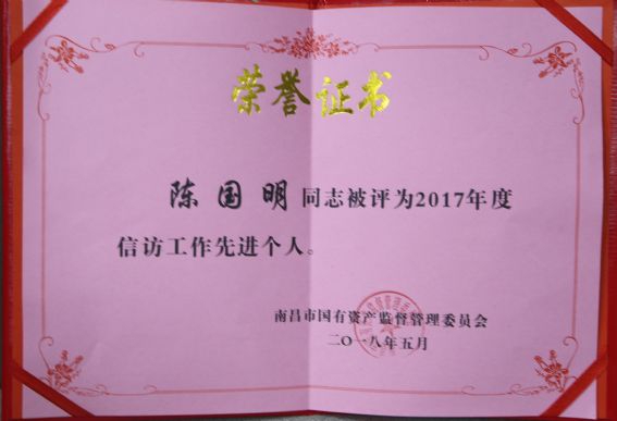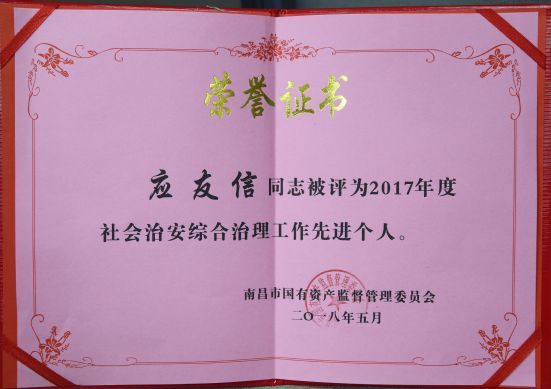 公司社會(huì)治安綜合治理和信訪工作榮獲國(guó)資委2017年度先進(jìn)單位,陳國(guó)明、應(yīng)友信同志榮獲國(guó)資委2017年度先進(jìn)個(gè)人稱(chēng)號(hào)。