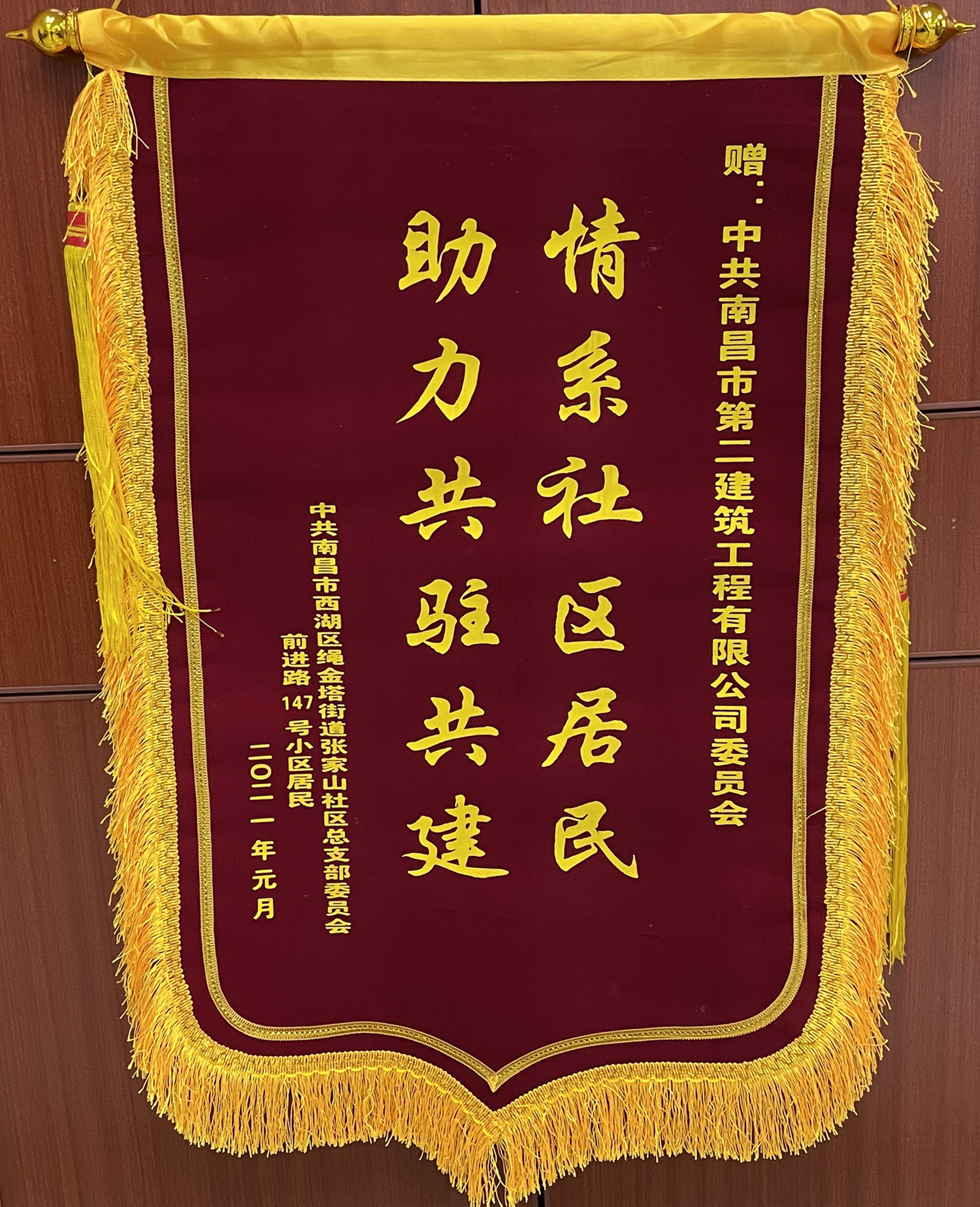 3月9日下午,南昌市西湖區(qū)張家山社區(qū)干部群眾一行來到南昌市第二建筑工程有限公司,代表社區(qū)黨總支部和20多戶社區(qū)居民向公司黨委書記、董事長(zhǎng)王彥送上“情系社區(qū)居民,助力共駐共建”錦旗,并再三表示感謝,言語之間,情意切切。