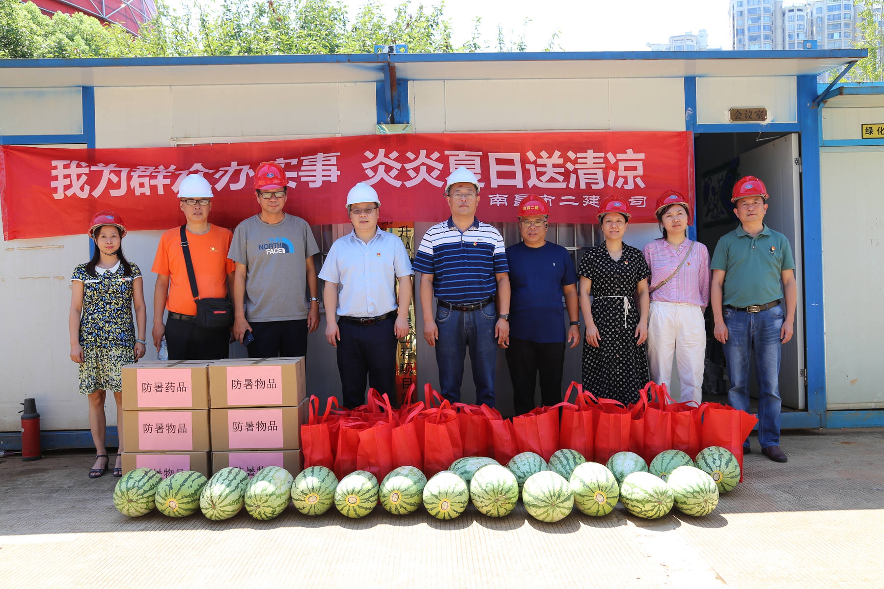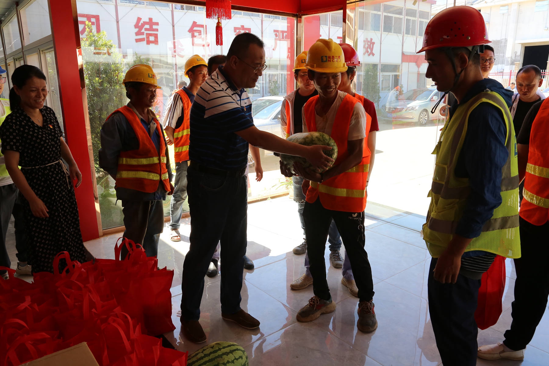烈日炎炎,持續(xù)高溫。為了給奮戰(zhàn)在工程一線的廣大員工帶去企業(yè)的關(guān)懷,7月22日,公司相關(guān)部門在南旅建工集團(tuán)總經(jīng)理、公司黨委書記、董事長(zhǎng)王彥,南旅建工集團(tuán)黨委副書記、常務(wù)副總經(jīng)理龔戩,公司紀(jì)檢書記王小華、工會(huì)主席付蓉等領(lǐng)導(dǎo)率領(lǐng)下,先后來(lái)到“繩金塔民俗風(fēng)情街”工程項(xiàng)目部、“滕王閣南擴(kuò)”項(xiàng)目部及“南昌市第六糧庫(kù)易址重建”工程項(xiàng)目部,開展“我為群眾辦實(shí)事 炎炎夏日送清涼”活動(dòng)。每至一處,送上大批西瓜、綠豆、冰糖等防暑物品及藥品,并詢問(wèn)項(xiàng)目部防暑降溫工作落實(shí)情況,督促項(xiàng)目部把工程建設(shè)與職工健康安全同時(shí)抓牢實(shí),確保項(xiàng)目建設(shè)正常推進(jìn)。