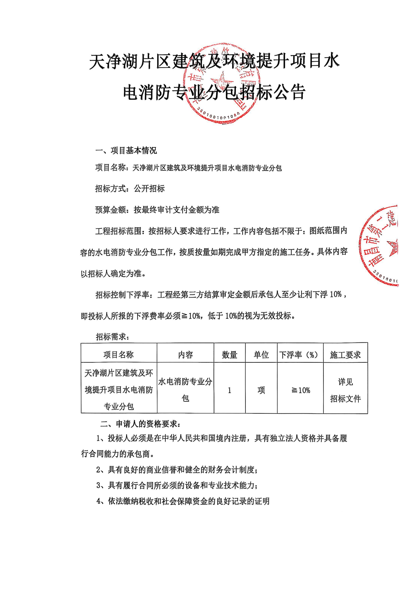 天凈湖片區(qū)建筑及環(huán)境提升項目水電消防專業(yè)分包招標公告
