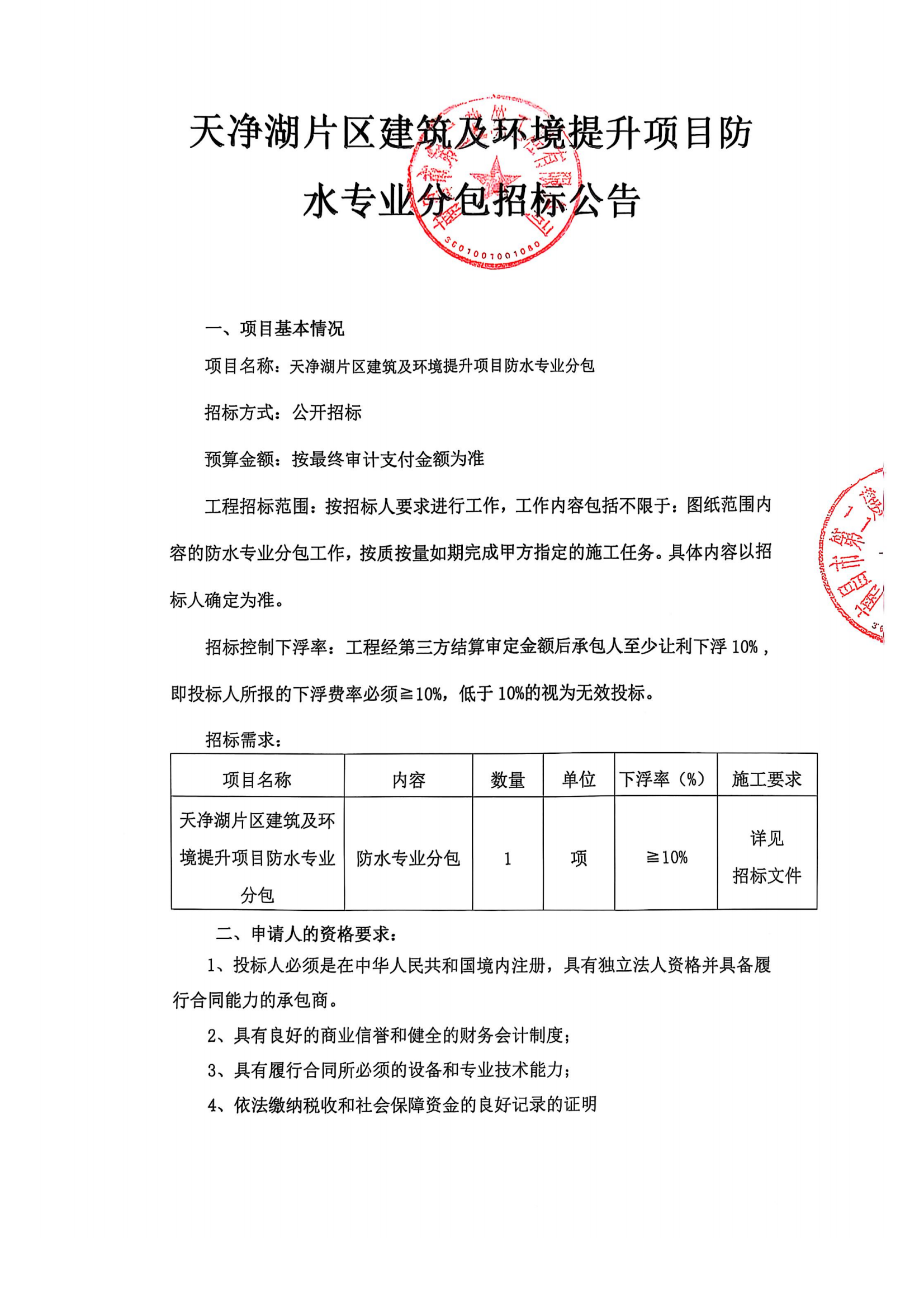 天凈湖片區(qū)建筑及環(huán)境提升項目防水專業(yè)分包招標(biāo)公告